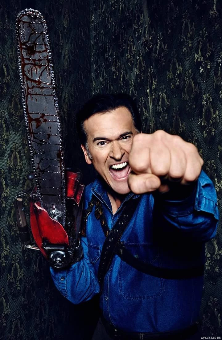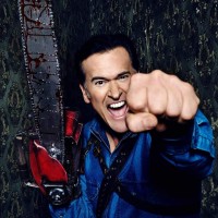 Evil Dead" series of horror movies. His expression and body language suggest excitement or intensity. This style of image could be associated with the horror or action genres, particularly as it references a popular