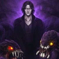 a serious expression, wearing dark clothing that could suggest they are part of a story or game involving these creatures. The background has an ominous purple hue and appears to have a hazy or misty quality, which adds to
