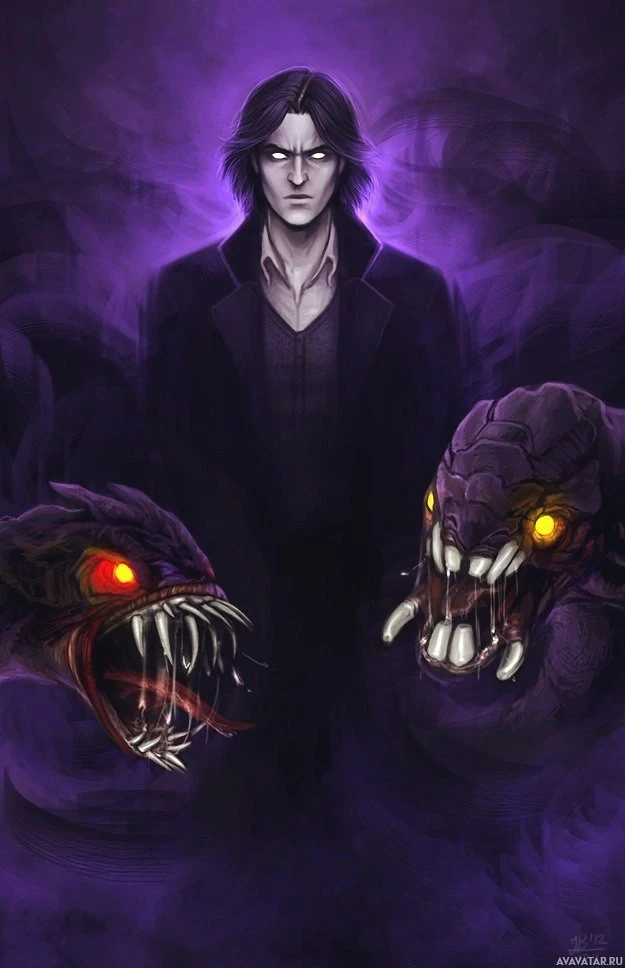 sharp teeth. Between them stands a humanoid figure with
