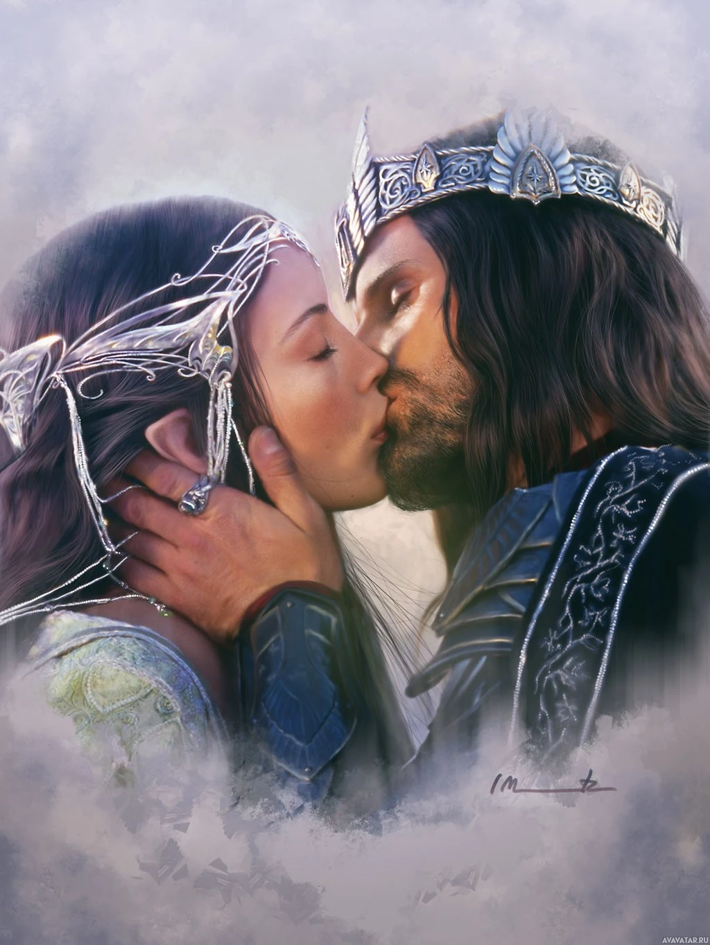 The image depicts two characters from the "Lord of the Rings" universe, Arwen and Aragorn. They are portrayed in a romantic scene where they share an intimate kiss against a soft-focus backdrop that appears to represent Middle-earth,