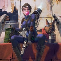 dog with a bandana around its neck sits next to them. The setting appears to be post-apocalyptic or in
