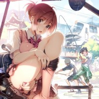 a school uniform and appears to be looking down with her hand on her knee. The background suggests a rural or village setting with buildings that resemble traditional Japanese architecture. In the distance, there are characters engaged in