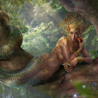 a fantasy scene featuring a naga, which is a mythical creature with the body of a human and the tail of a snake. The naga appears to be adorned in elaborate jewelry and costume, sitting on the ground next to what looks like