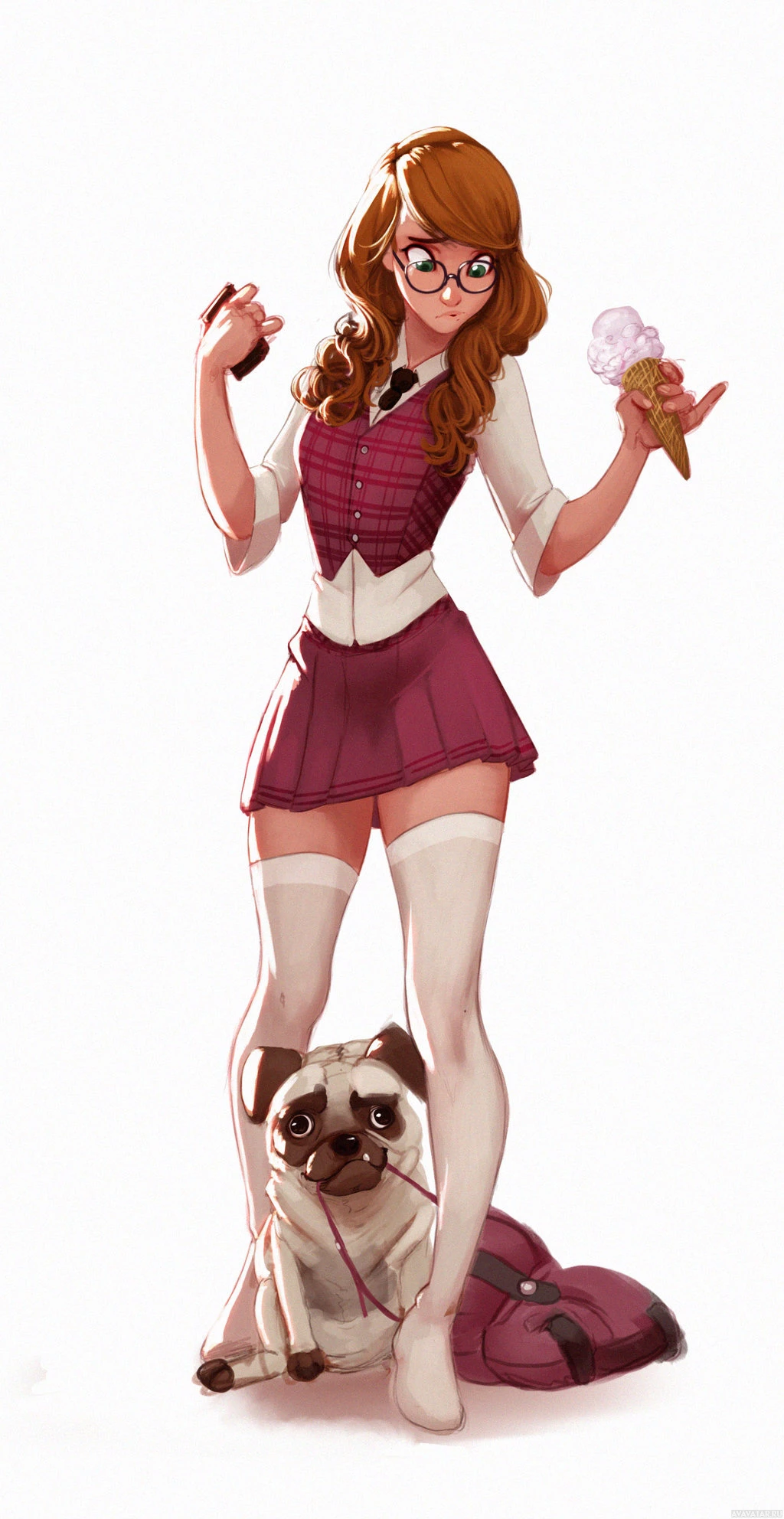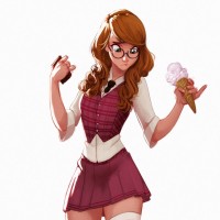 a young woman with red hair, wearing glasses. She is sitting on the ground and appears to be holding