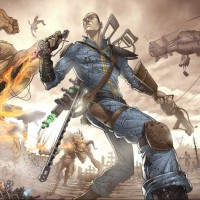 version of the game "Fallout." It features a character dressed in blue and white armor, holding a gun with both hands as if ready for combat. Surrounding the central figure are various other characters and elements from the game, including a super mutant, an armed robotic enemy, and destroyed buildings indicative of