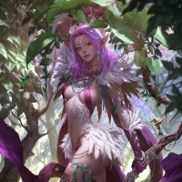 purple hair and is adorned with various accessories and clothing that give her a mystical look, including what seems to be feathers or fur on her shoulders and chest. She's holding a bow in one hand while the other arm is wrapped around