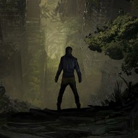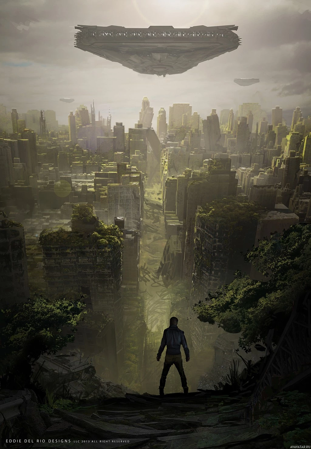 a post-apocalyptic cityscape. In the foreground, there is a silhouette of an individual standing on