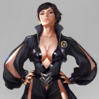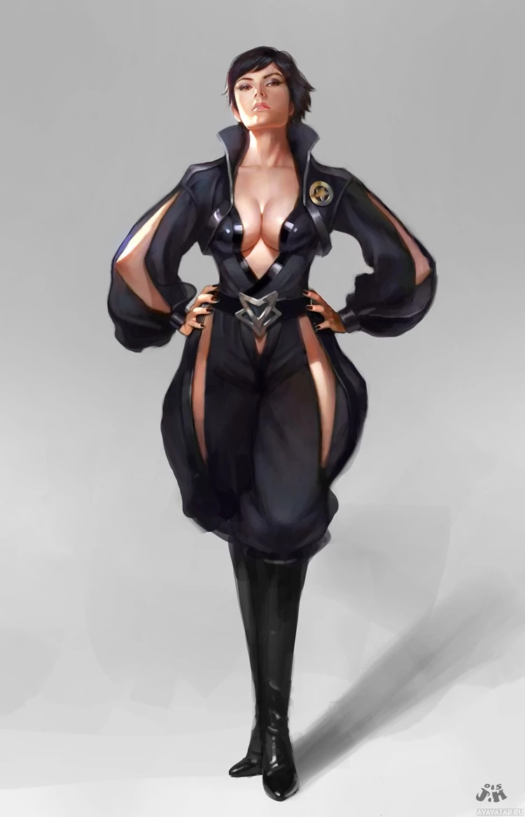 dark hair and is wearing a uniform with a distinctive design that suggests she might be some kind of special operative or warrior. Her attire includes elements like buckles and straps that give her an edgy and formidable look. The artwork itself seems to be focused on
