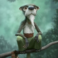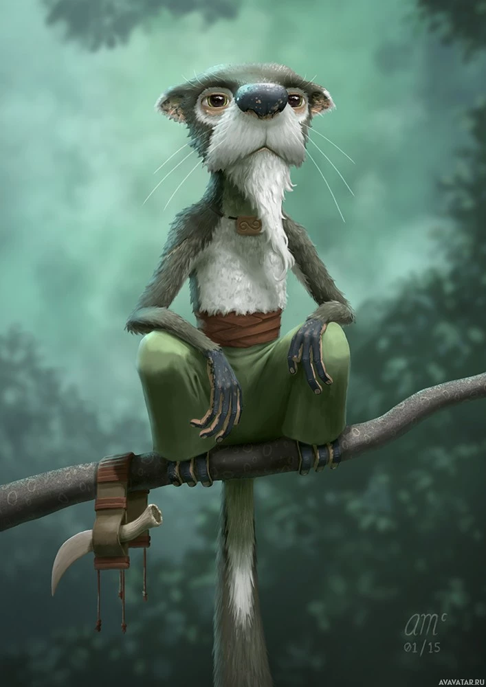 Изображение имеет анимированный персонаж, напоминающий ласку или хорька. У этого существа выдающийся нос и большие глаза, которые характерны для таких животных. Он изображен сидящим на ветке в том, что кажется лесом с туманными или туманными условиями. Стиль изображения предполагает, что он может быть связан с фэнтези или анимированными жанрами.