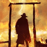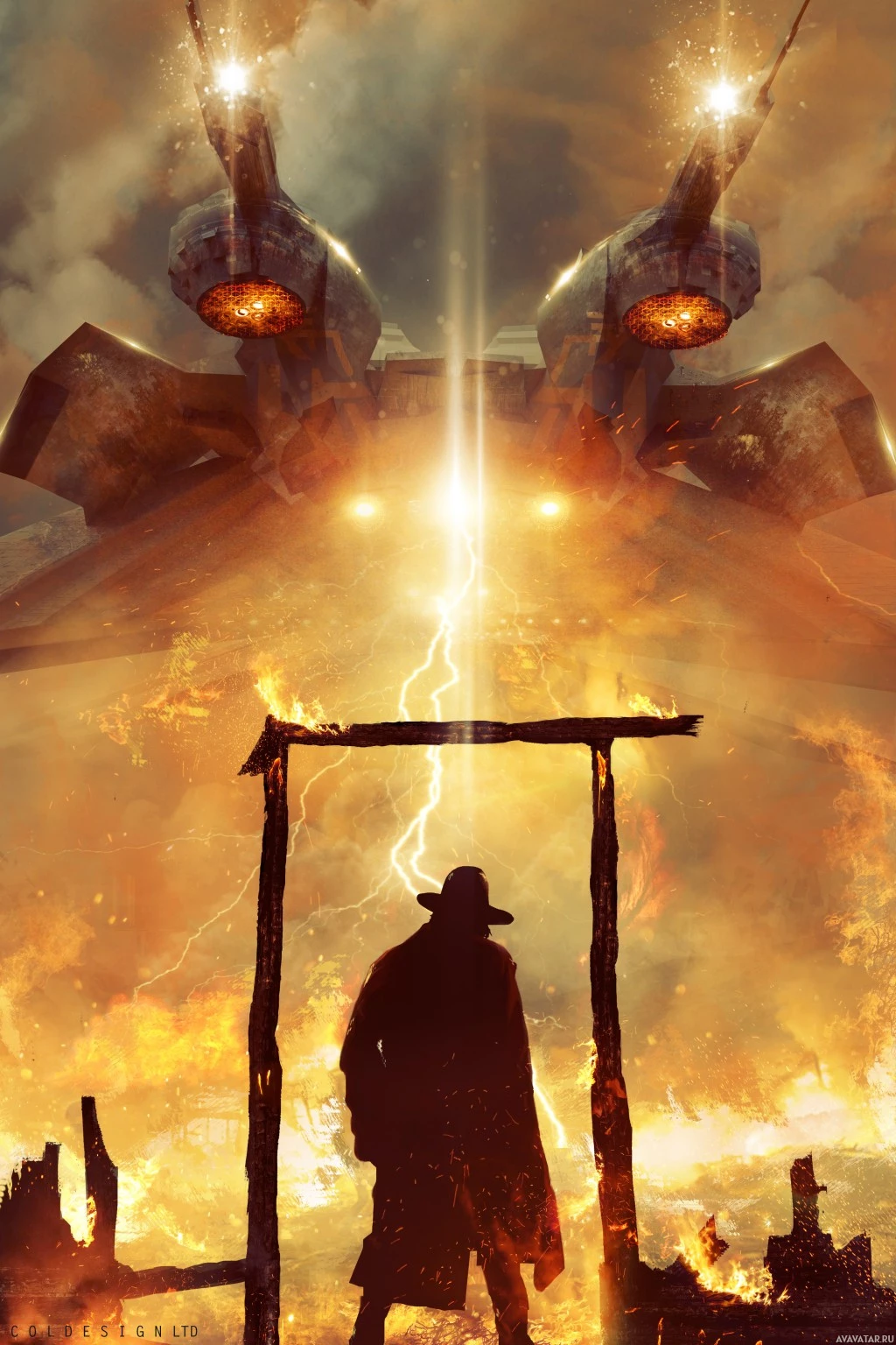 a silhouette of a man on the left, wearing a hat and standing in front of what appears to be an apocalyptic or battlefield setting. On the right side of the image, there's a large mechanical structure that resembles a tank or