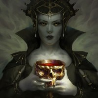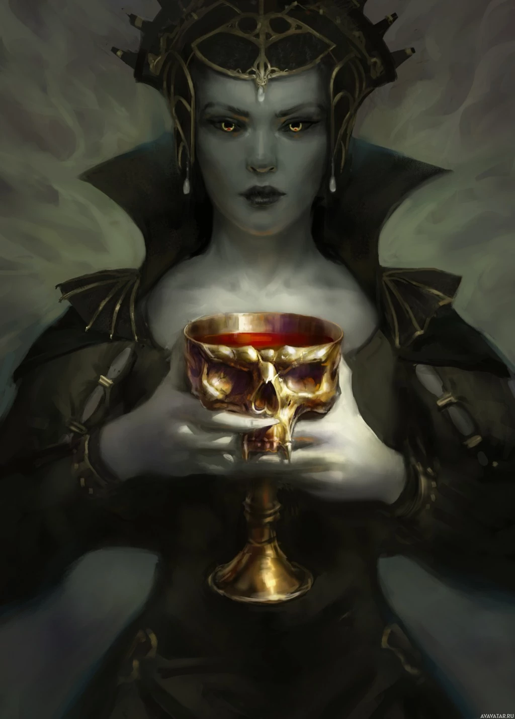 supernatural abilities or status, such as the horn-like protrusions on her head and the ornate jewelry. The central focus of the image is a goblet she holds in both hands, which may contain blood, further emphasizing her
