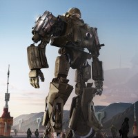 figures in the background that appear to be humans; however, they are quite small compared to the size of the robot, which emphasizes the scale of the machine. The setting suggests an industrial or post-apocalyptic cityscape with a large