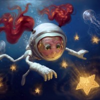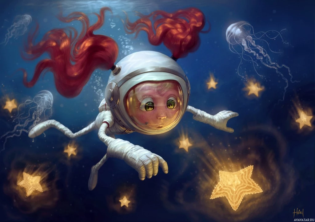 red ribbons on either side. This character appears to be floating underwater, surrounded by stars that are emanating light from below. There are also jellyfish in the background, contributing to