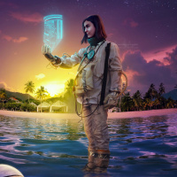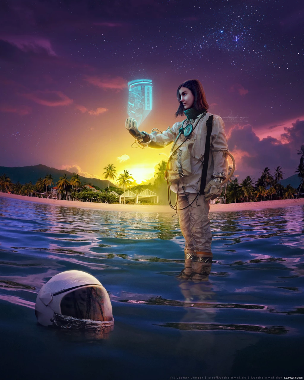 futuristic device. To her left, there's a space helmet floating on the water's surface, suggesting