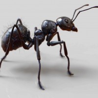 The image shows an ant. It is a common insect known for its small size and role in ecosystems as scavengers, foragers, and workers in social colonies. This particular ant appears to be standing on one leg.