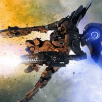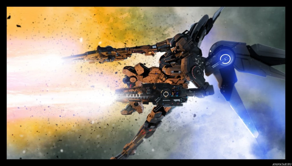 the dynamic poses of the mechs and the trails behind them. The design of these robots is detailed and mechanical, suggesting