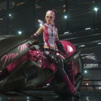 a female character sitting on a futuristic motorcycle. She appears to be in