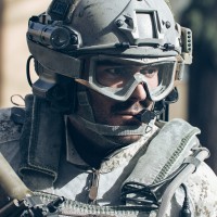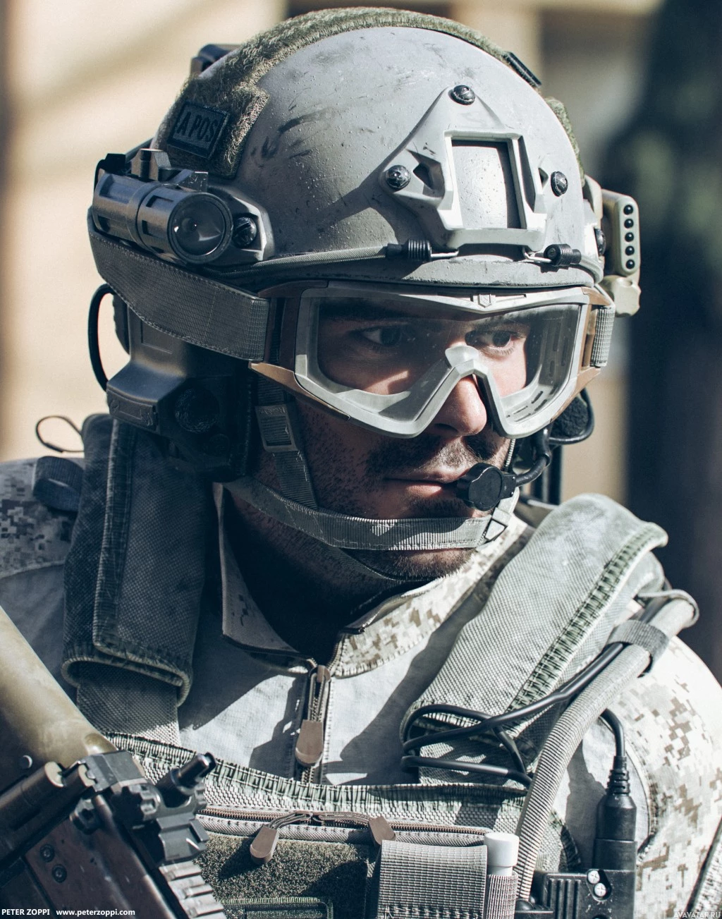 military attire and gear, including a helmet with a visor, likely for eye protection. He has