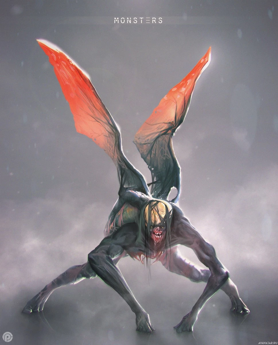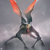 a humanoid figure. It has large bat-like wings and an elongated, pointed head with