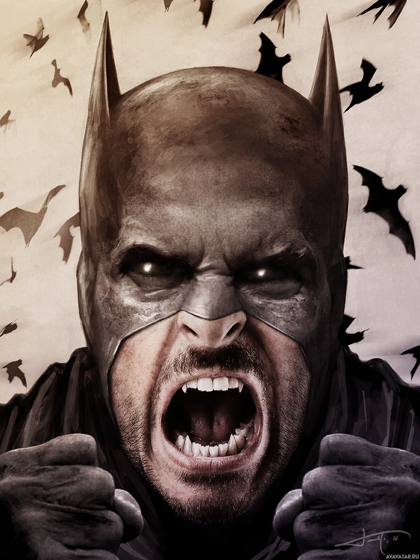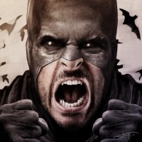 an intense expression, screaming or roaring while surrounded by bats. The background is blurred, but it appears to be nighttime, which fits the theme typically associated with this character. The design elements suggest that this could be