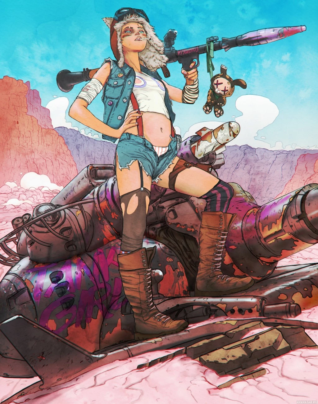 a young woman or girl, standing confidently amidst a battlefield. She is holding a weapon that resembles a bazooka or rocket launcher. Her attire consists of