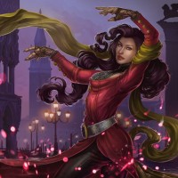an urban setting at night, possibly inspired by European architecture, as indicated by the structures that resemble cobblestone streets and archways typically found in such locations. There is a whimsical quality to the artwork, with magical elements like sparkles and energy emanating from her hands, which adds a fantastical element to the scene.