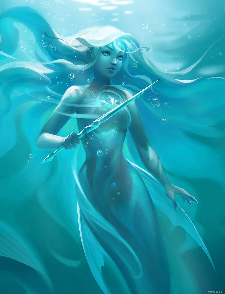a serene environment, surrounded by bubbles that suggest movement through the water. The overall impression is one of mystique and enchantment, fitting for a character of