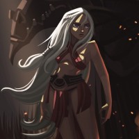 white hair. She is wearing armor and appears to be in a battle-