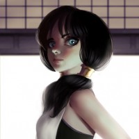 a female character. She has short black hair and is wearing a white