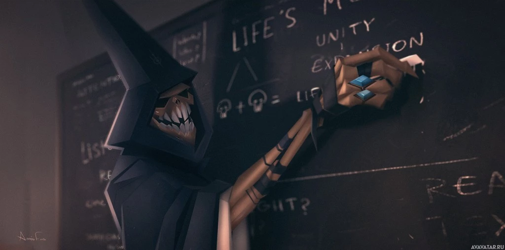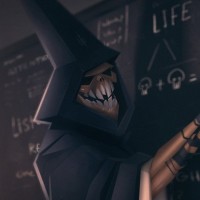 an animated character that appears to be a skull with some mechanical or robotic features. The character seems to have one arm and is interacting with chalk on a chalkboard. There are several words written on the chalkboard, which include "Life," "Love," "Unity," "Eternity," "Wisdom," "Faith," and "Grace." The setting looks like a classroom or lecture
