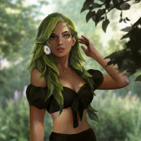 green skin and a lush mane of leaves, which are common visual elements associated with dryads. She has a flower tucked behind her ear, adding to