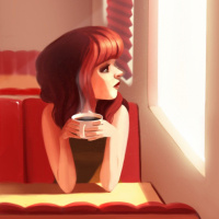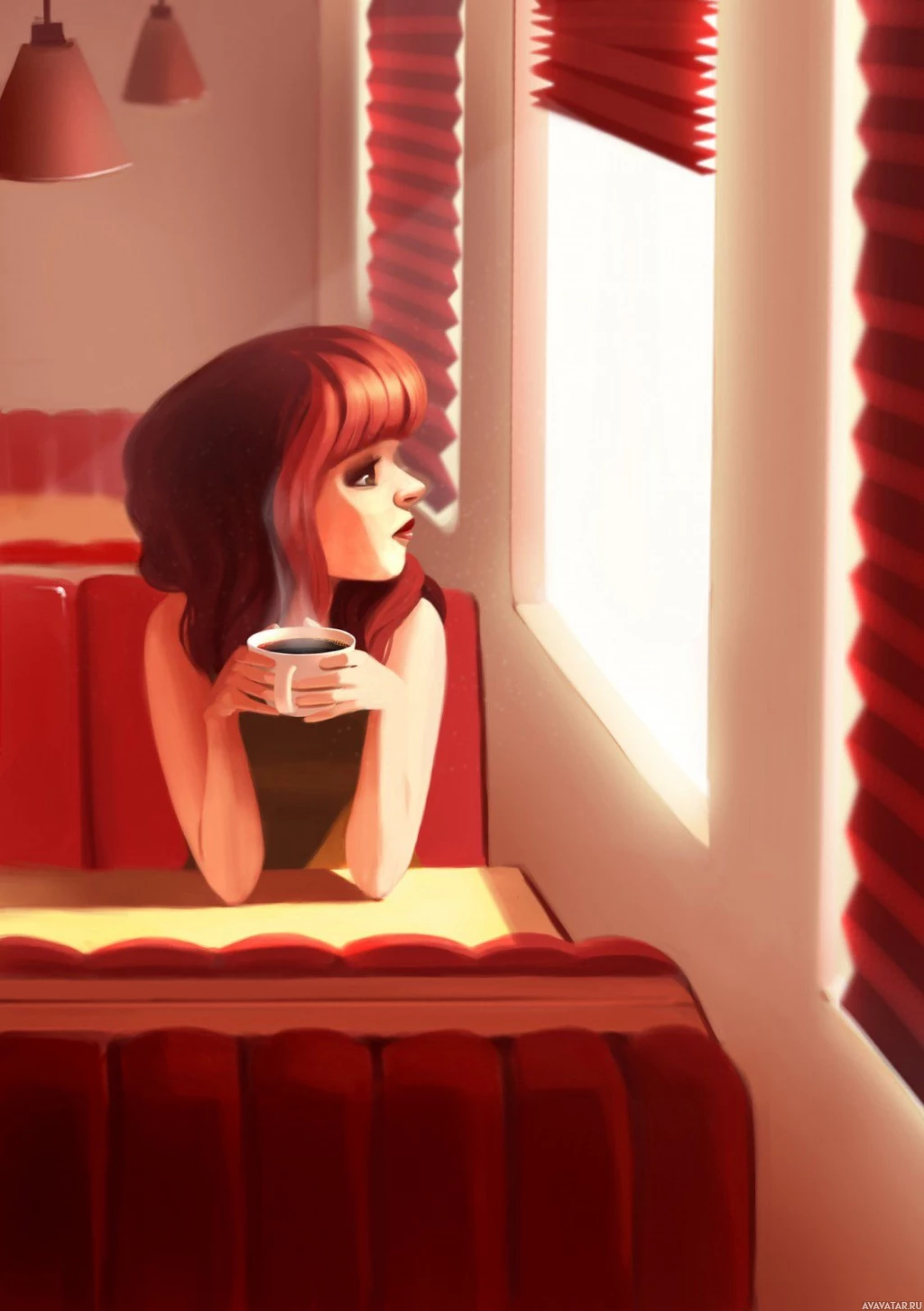 red hair, sitting at a booth inside what appears to be a diner or restaurant. She has her chin propped on her hand and is looking out the window towards the sunset. There's
