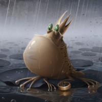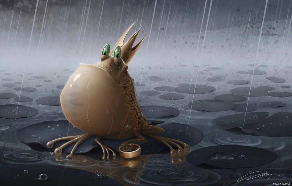 anthropomorphic frog wearing a crown, which adds a royal or majestic element to its appearance. The frog is situated on what looks like