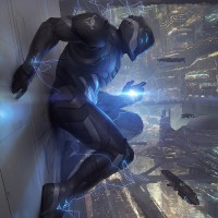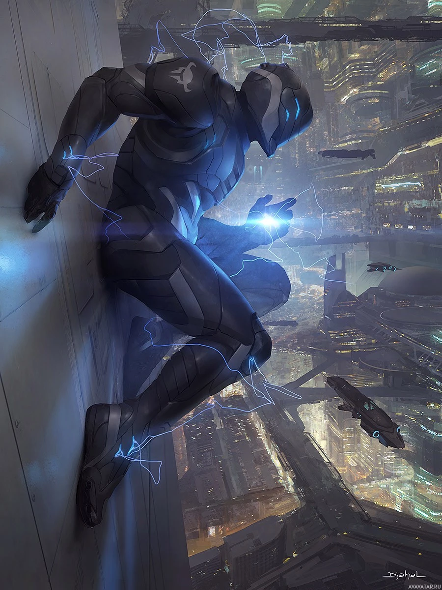 futuristic armor, possibly an Iron Man suit or similar design, clinging to the side of a building as if it is made of glass or crystal. There are