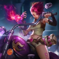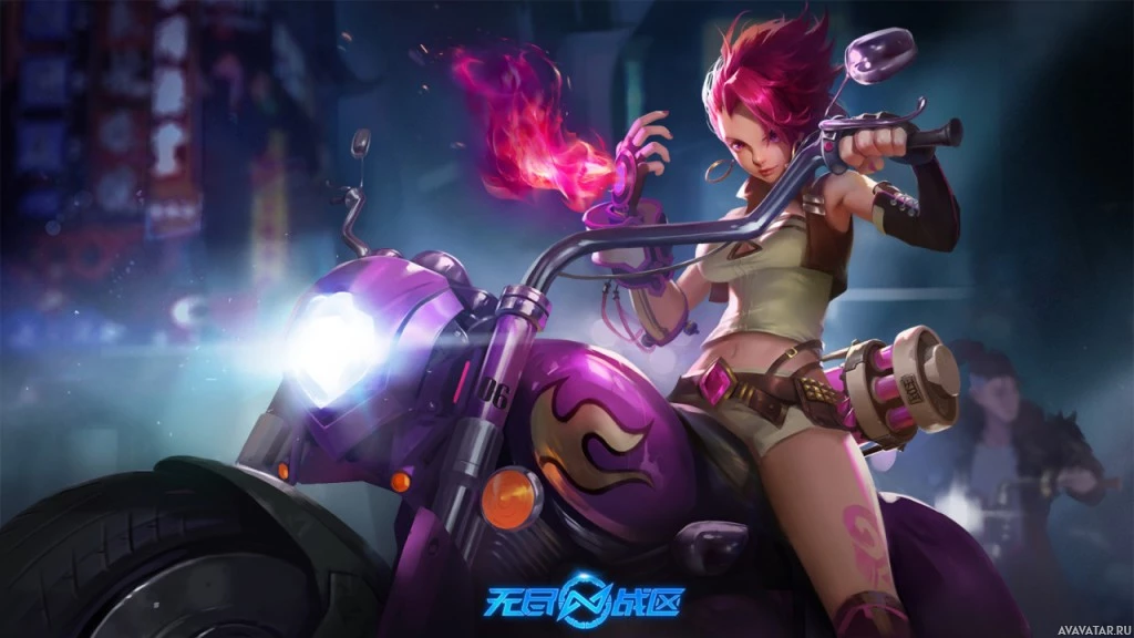 The image features a female character with pink hair, riding a motorcycle. She appears to be a playable character in a video game or animated series due to her stylized appearance and the graphic design elements within the image. The character is depicted in a dynamic pose, suggesting movement or action.