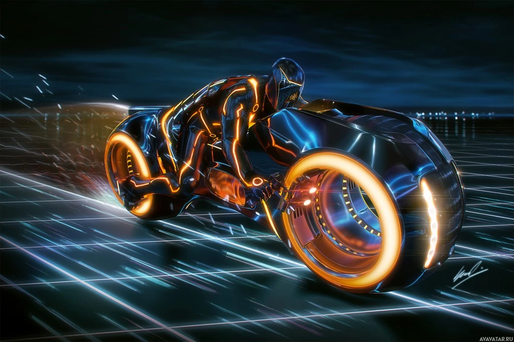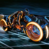 a futuristic motorcycle, likely from the movie "Tron." The design is sleek and high-tech, with glowing elements that suggest
