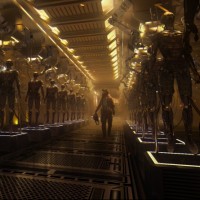 a science fiction setting, showing an interior space that looks like the inside of a spaceship or station. There are numerous