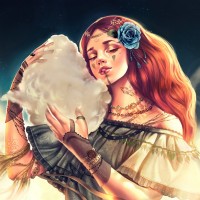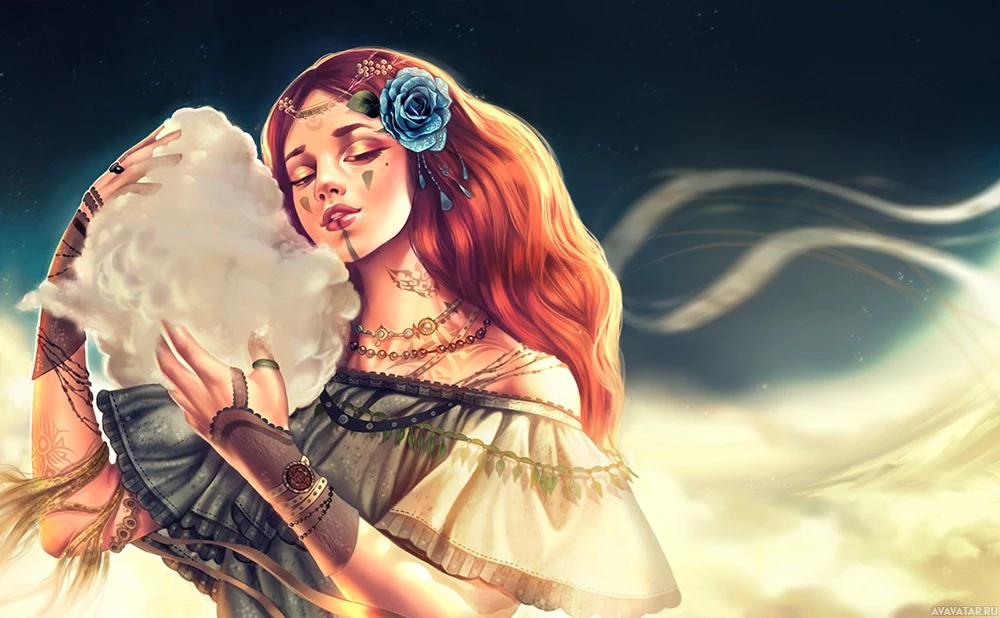 red hair. She appears to be in an ethereal or dreamlike setting, possibly inspired by fantasy or mythology themes. The girl has