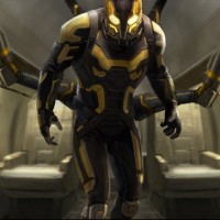 a humanoid robot that has been depicted in various media as a character known for its advanced technology and combat abilities. It is wearing a yellow and black suit and is standing between two