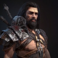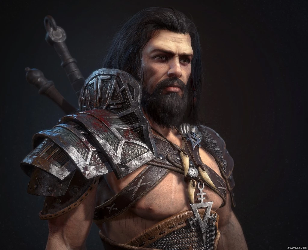 long hair, which suggests he might be portraying an older, experienced warrior.