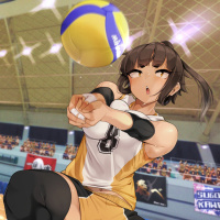 a volleyball uniform with the number 6 on it and is shown in action, possibly serving or hitting the ball with her right hand, which is adorned with a volleyball glove. The character has a determined expression and is set against