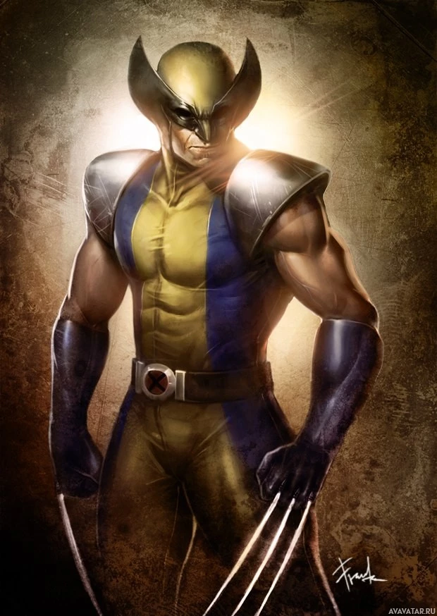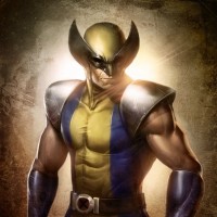 iconic costume which includes a yellow and blue suit with metal claws extending from each hand. The background has a gritty texture that suggests
