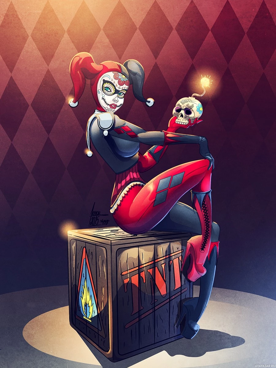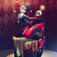 red lipstick. Harley Quinn is holding a skull, which she often carries as a prop or accessory, symbolizing her chaotic and violent nature. The background suggests