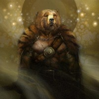 a celestial body that could represent the moon or sun. There are also halo-like lights emanating from the bear's head, suggesting it may be viewed as