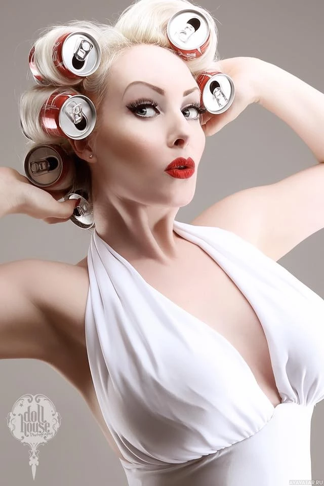blonde hair and is wearing a white, fitted swimsuit with a high neckline. The woman is using rollers on her hair while also holding multiple cans of