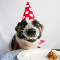 The image shows a dog wearing a party hat and