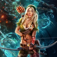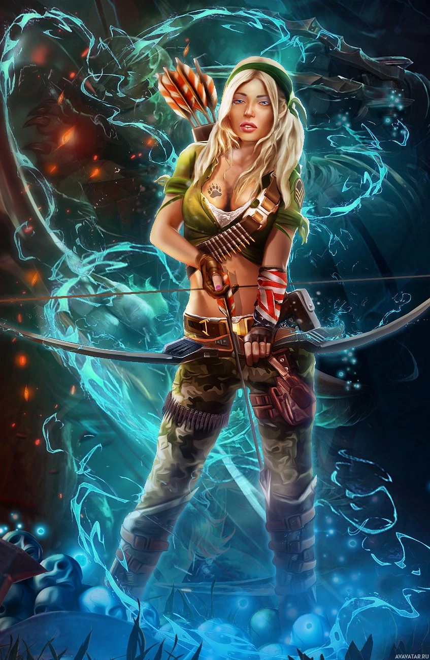 blonde hair and is wearing green clothing with a bow in her hand. It seems like the image may be of a female avatar or character from