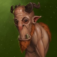 Картинка показывает иллюстрацию фантастического существа. По-видимому, это человекоподобная фигура с головой и рогами быка, возможно, напоминающая минотавра, стоящего в лесу или джунглях с зеленым туманом или туманом на заднем плане.