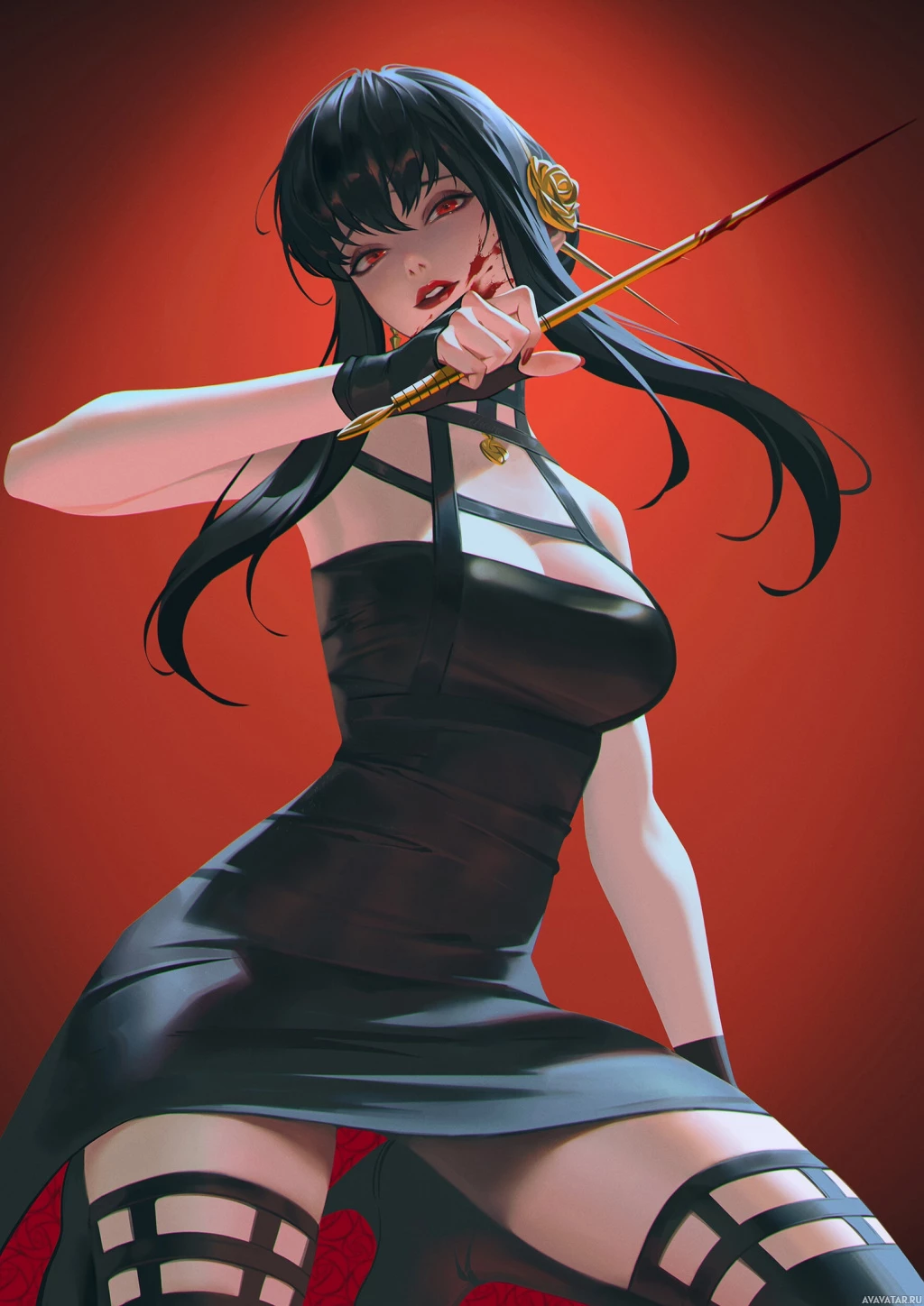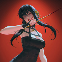 На картинке изображен анимированный персонаж, девушка с чёрными волосами. Она изображена в динамической позе с луком и стрелой, что говорит о том, что она может участвовать в какой-то форме боя или действия. Ее одежда состоит из черного платья с ремнями на плечах и бедрах, придавая ему готический или, возможно, фантастический вид. Фон имеет красноватый оттенок, добавляющий к интенсивности сцены.