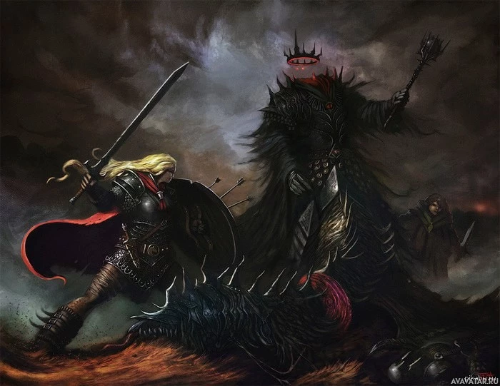 wearing armor. On the right, there is a character resembling Sauron, known as